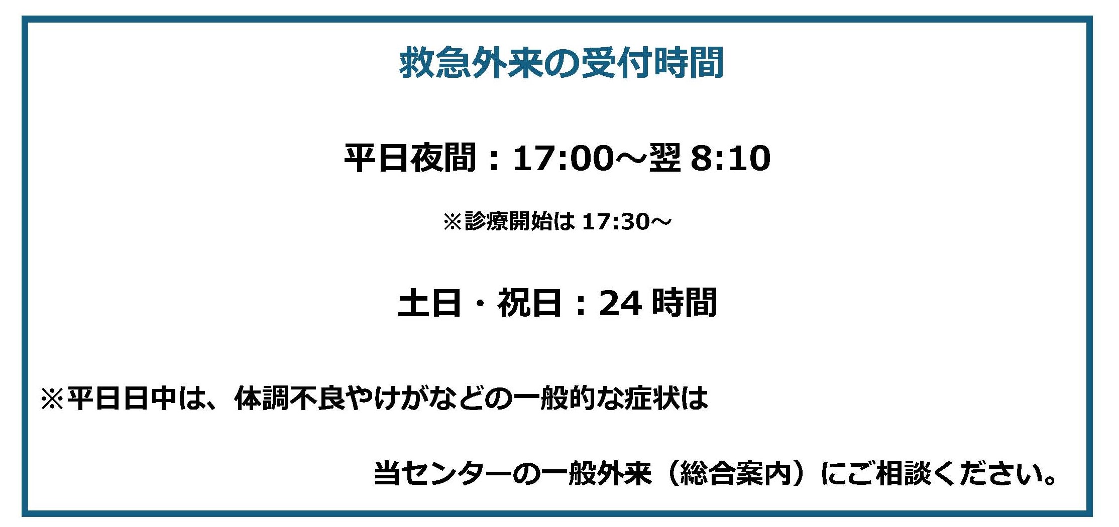 当センターの救急外来は、夜間・休日に急な体調不良やけががあった際、事前のお電話なしで直接来院いただける外来です。地域の皆さまに安心してご利用していただけるよう、受診前に以下の内容をご確認ください。