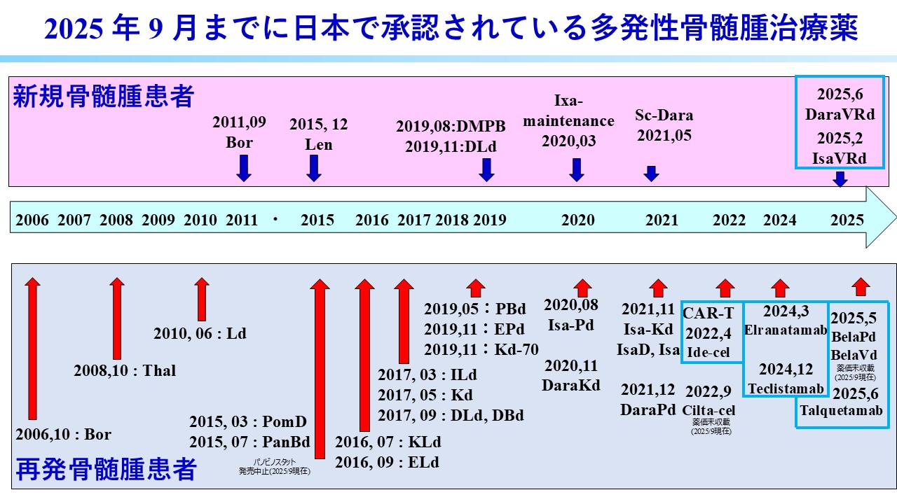 さらに、BCMAではなくGPRC5Dを標的とした二重特異性抗体であるタービー®が2025年6月に承認されました。BCMAを標的とした治療後にも一定の効果が報告されています。その他にも、まだ薬価はついていませんが、BCMAを標的とした抗体に抗がん剤を結合させたADC製剤であるブーレンレップ®も承認され、治療の選択肢がさらに増えました。