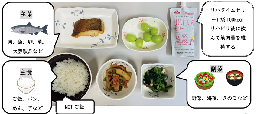 病院食において基準となる常食(1600kcal)という食事に、昼食および夕食のご飯150gに対してMCTオイル小さじ1杯(約6g)をまぜたご飯及びリハたいむゼリー1日1袋(100kcal、たんぱく質10g)によってエネルギー、たんぱく質を強化した食事のことです。