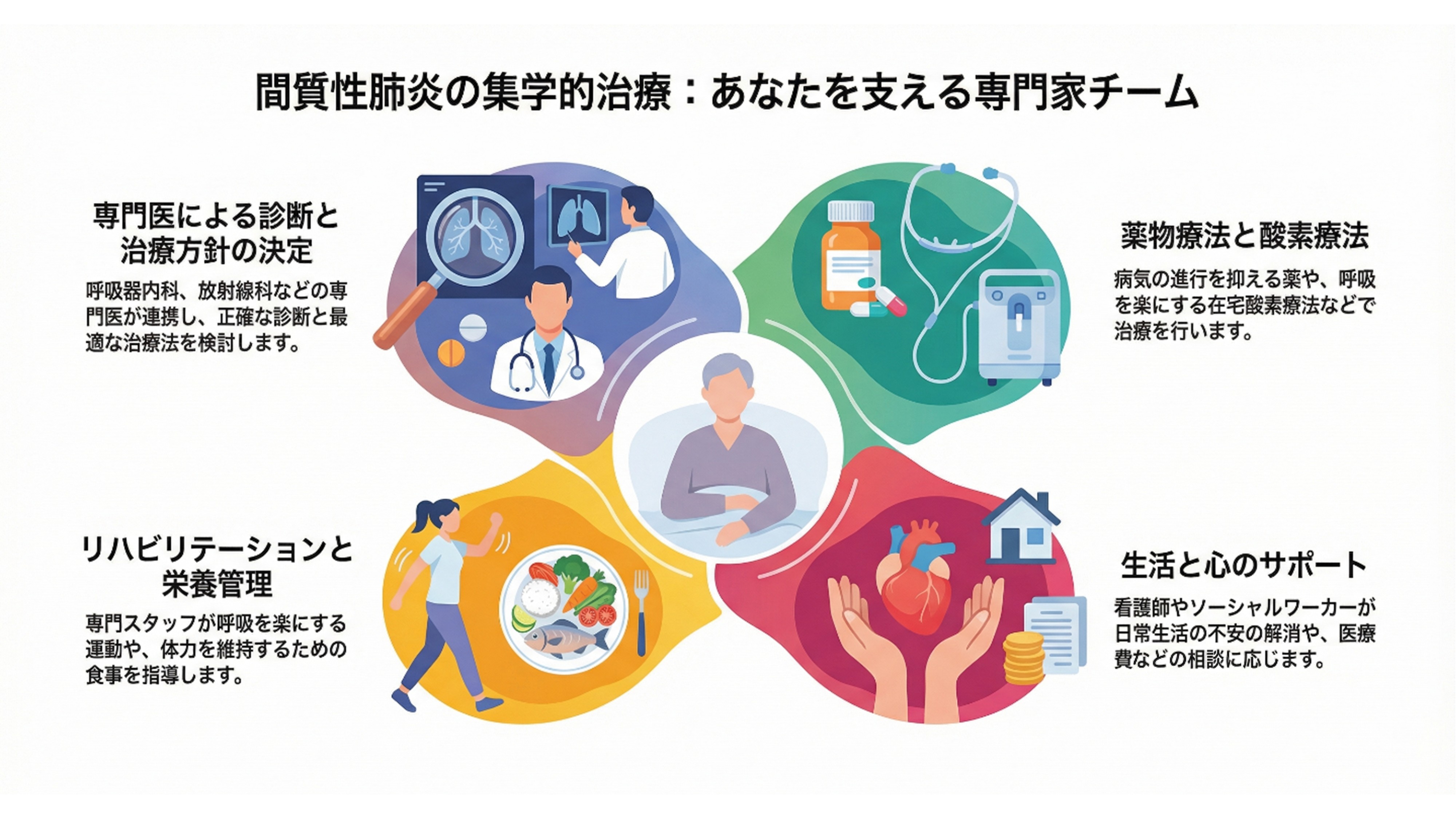 - 呼吸器内科医: 精密な診断と、薬物療法を中心とした治療計画の立案・統括を行います。
