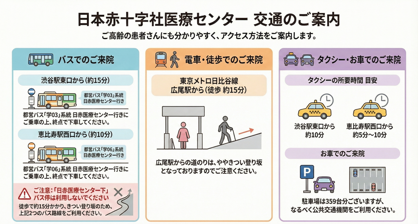 - JR・私鉄各線「渋谷駅」「恵比寿駅」より バスで約 10〜15 分(「日赤医療センター前」下車)