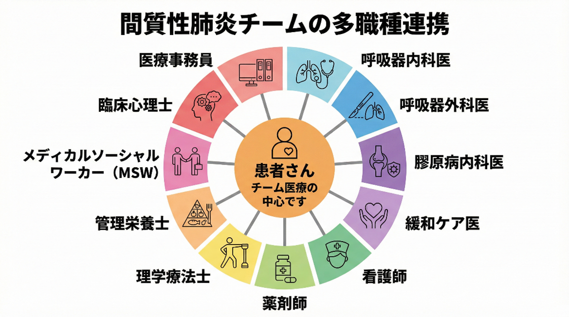 - 呼吸器外科医: 外科的肺生検による確実な診断や、手術が必要な場合の適切な対応を担います。