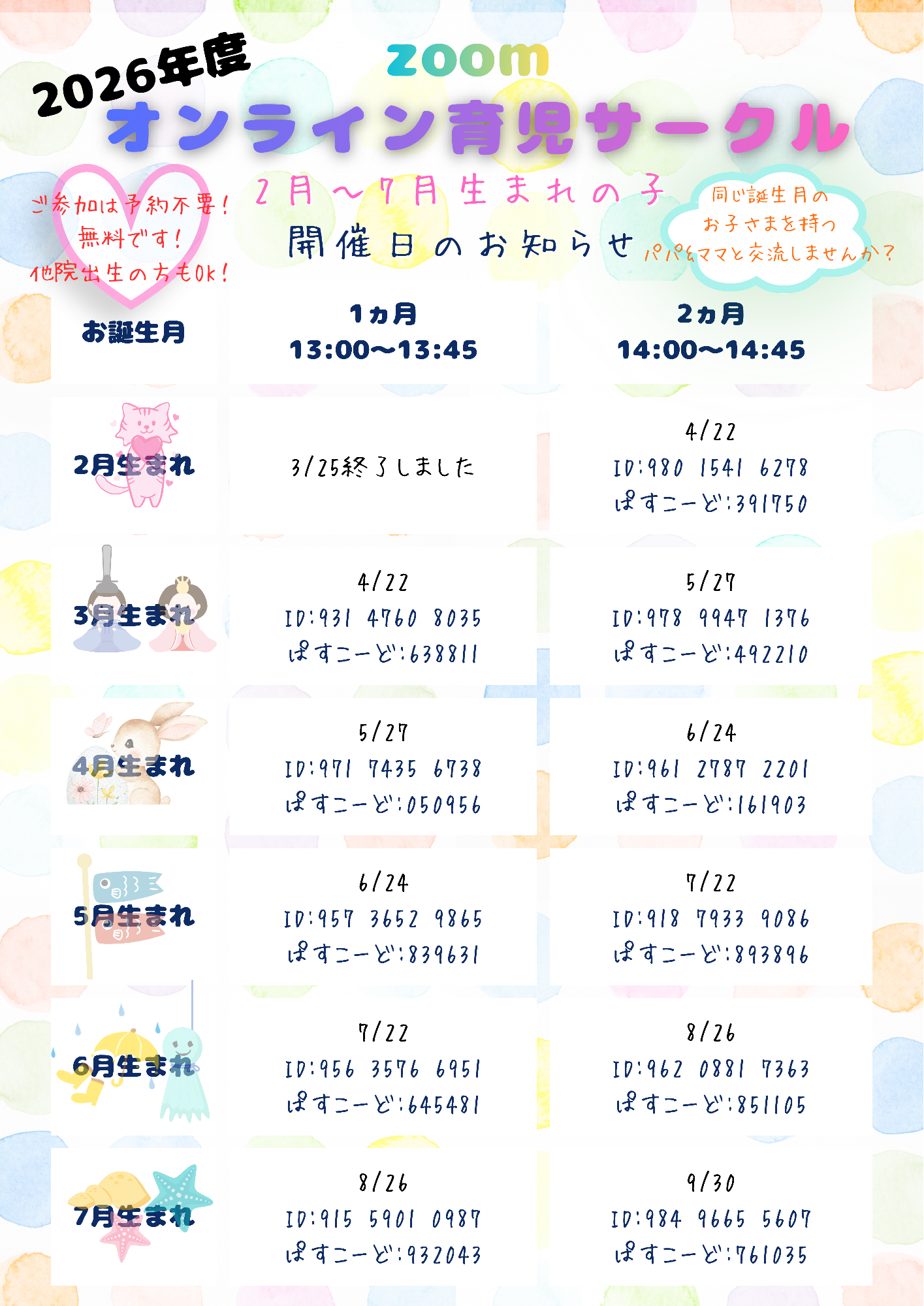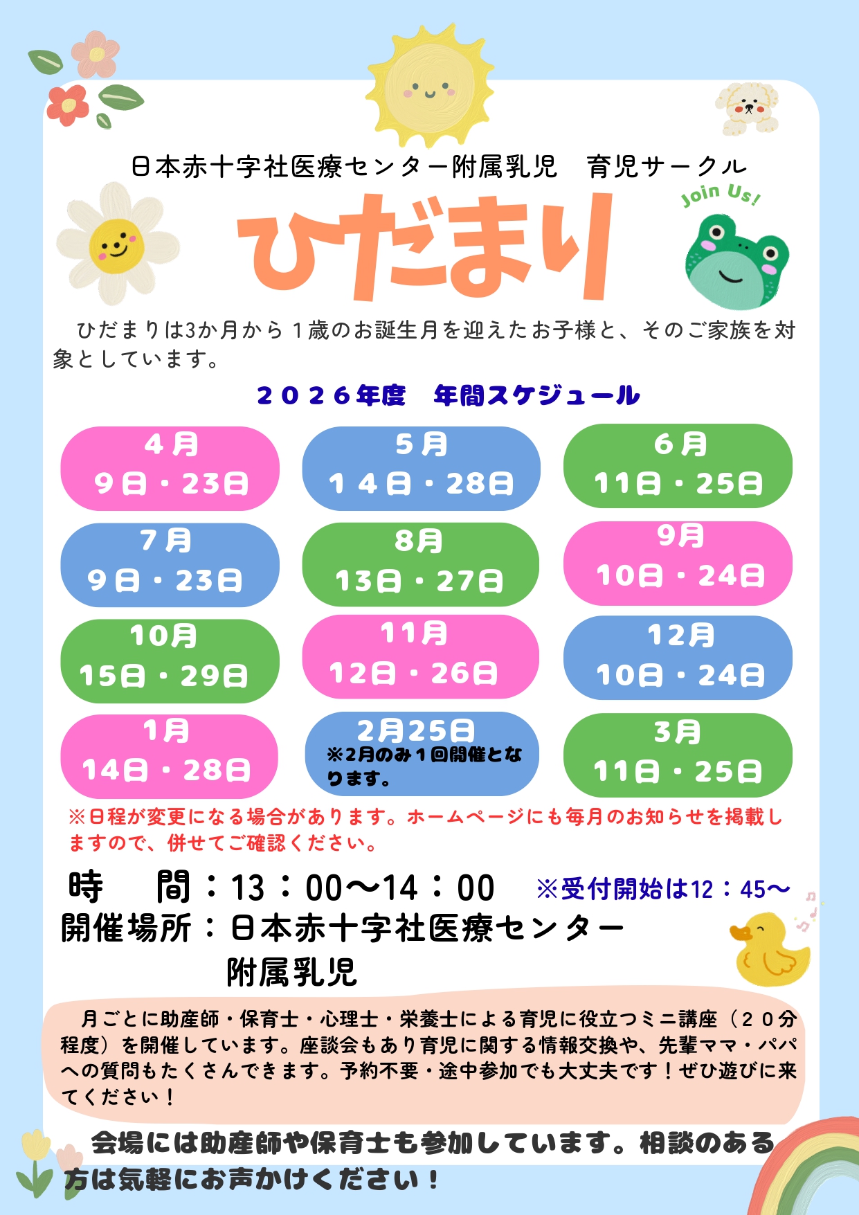 当センターの助産師や、附属乳児院の看護師・保育士・心理士・栄養士も参加しますので、お悩みがあればその場で