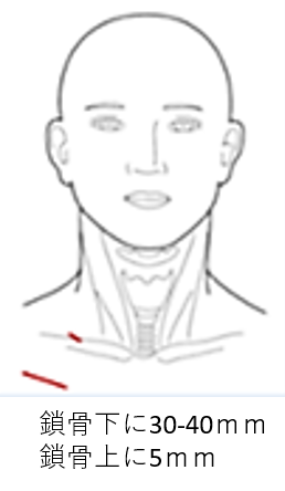 頸部を切開するこれまでの手術(通常法手術)では、傷跡が目立つ位置にできることから、患者さんの生活の質(Quality of Life: QOL)を低下させる恐れがあります。当センターで実施している内視鏡補助下頸部手術(Video-assisted neck surgery: VANS法手術)は、頸部に傷跡を残すことがなく、整容性に配慮した手術です。VANS法手術では、片側の鎖骨下の3cm程度と鎖骨上の5mmの2箇所の傷で手術を行います。