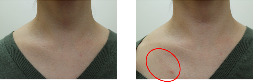最大のメリットは、頸部に傷跡が残らないことです。このような襟元が開いた衣服でも傷跡を隠すことができます。