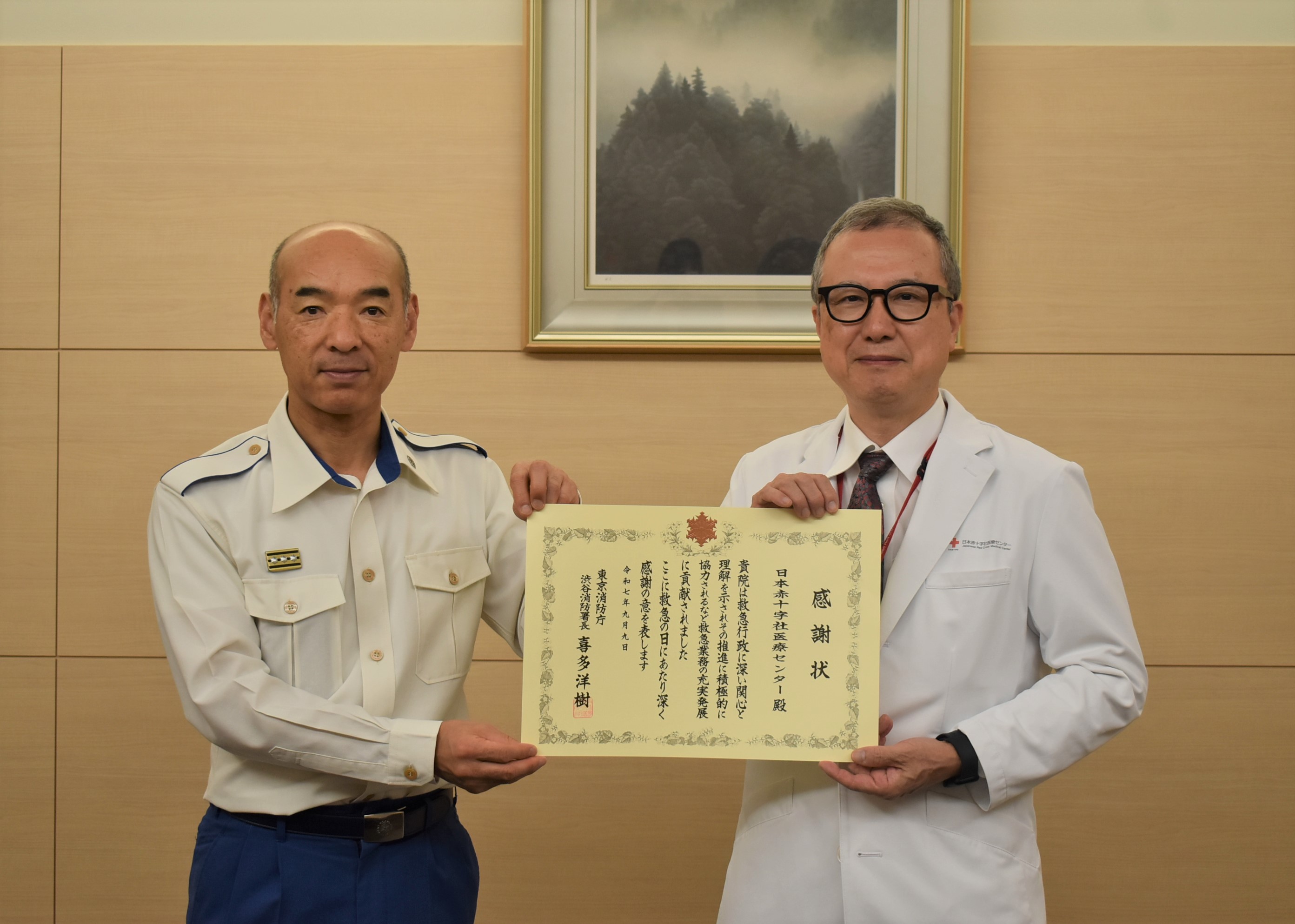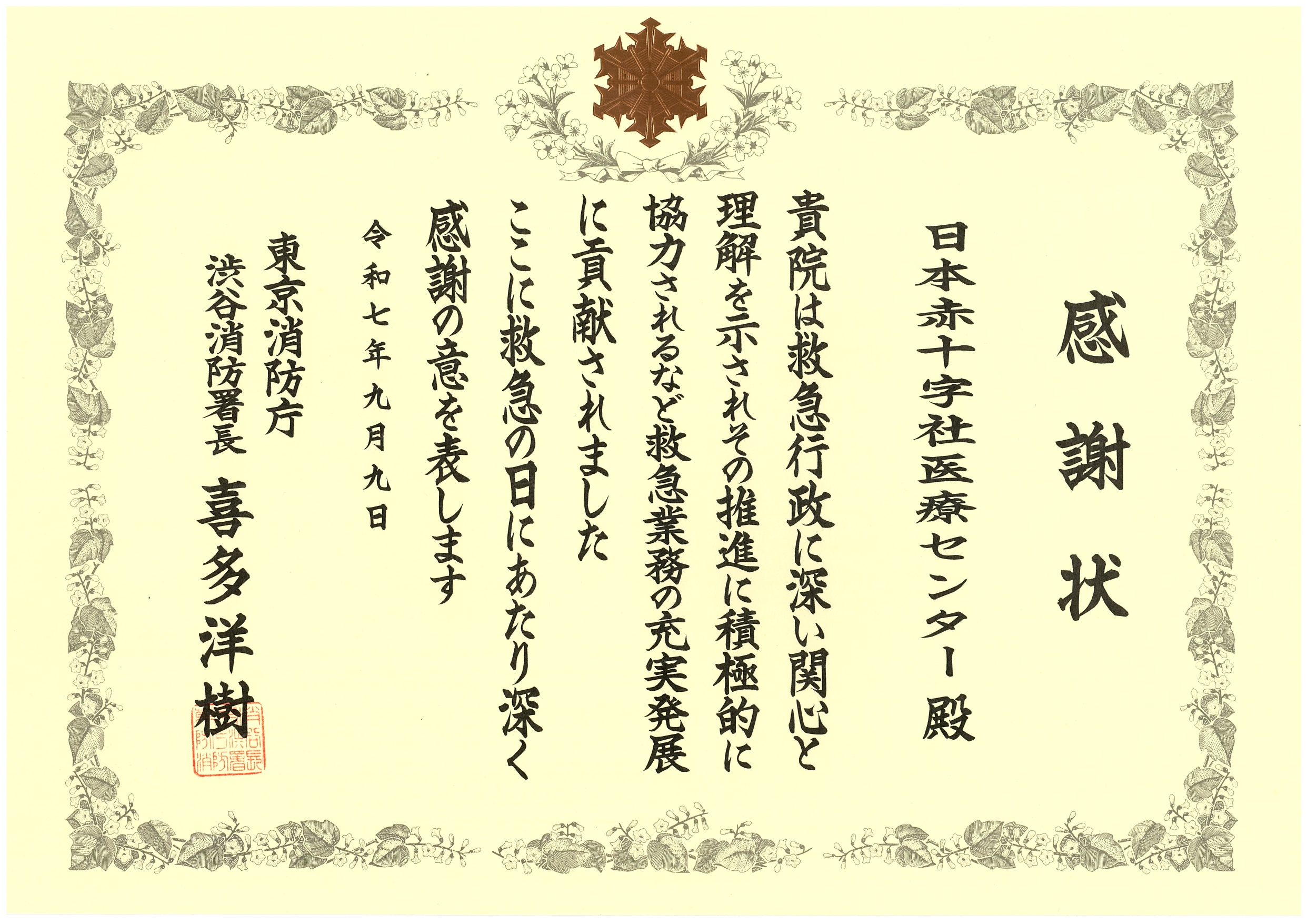 9月25日、「救急の日」に際し、日頃からの救急業務への協力や、職員による救命講習の継続的な受講が評価され、渋谷消防署長より感謝状をいただきました。