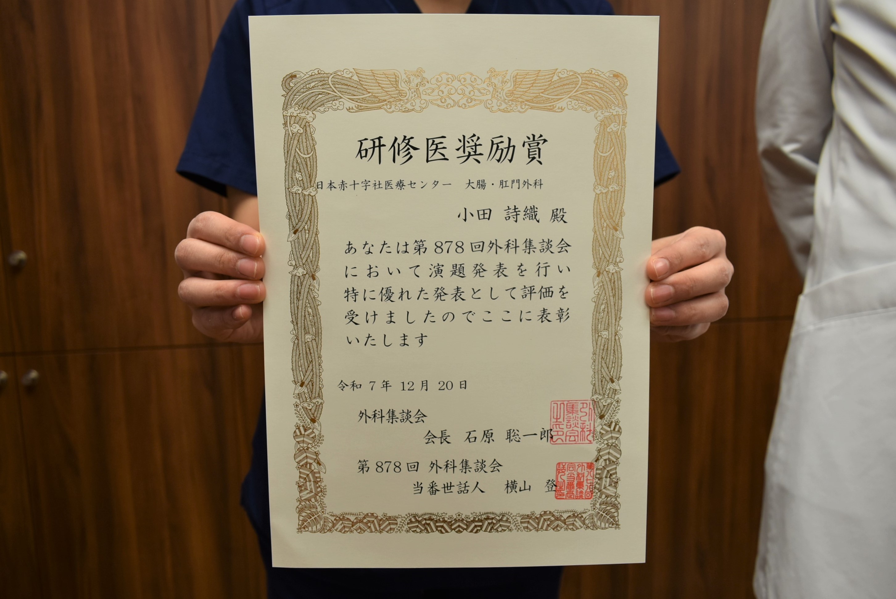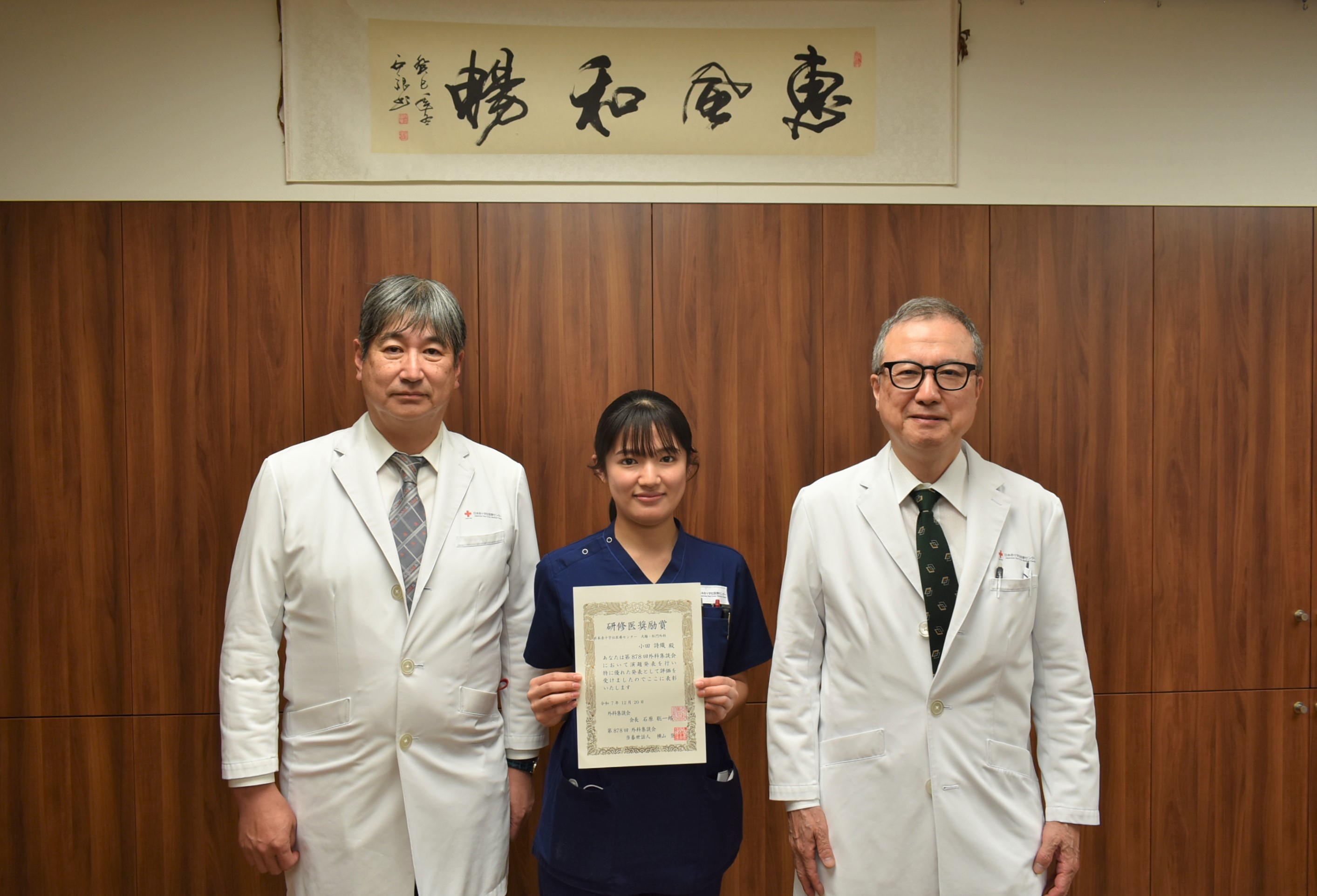 2025年12月20日に行われた第878回外科集談会において、当センター初期研修医(外科プログラムコース)の小田詩織医師が研修医演題奨励賞を受賞しました。 演題名は「膀胱内圧測定下にTAPP法を施行した巨大鼠径ヘルニアの一例」で、巨大鼠径ヘルニアの手術後に起こりうる腹部コンパートメント症候群を念頭に置いた周術期管理と膀胱内圧測定の有用性について考察を加えた症例報告です。