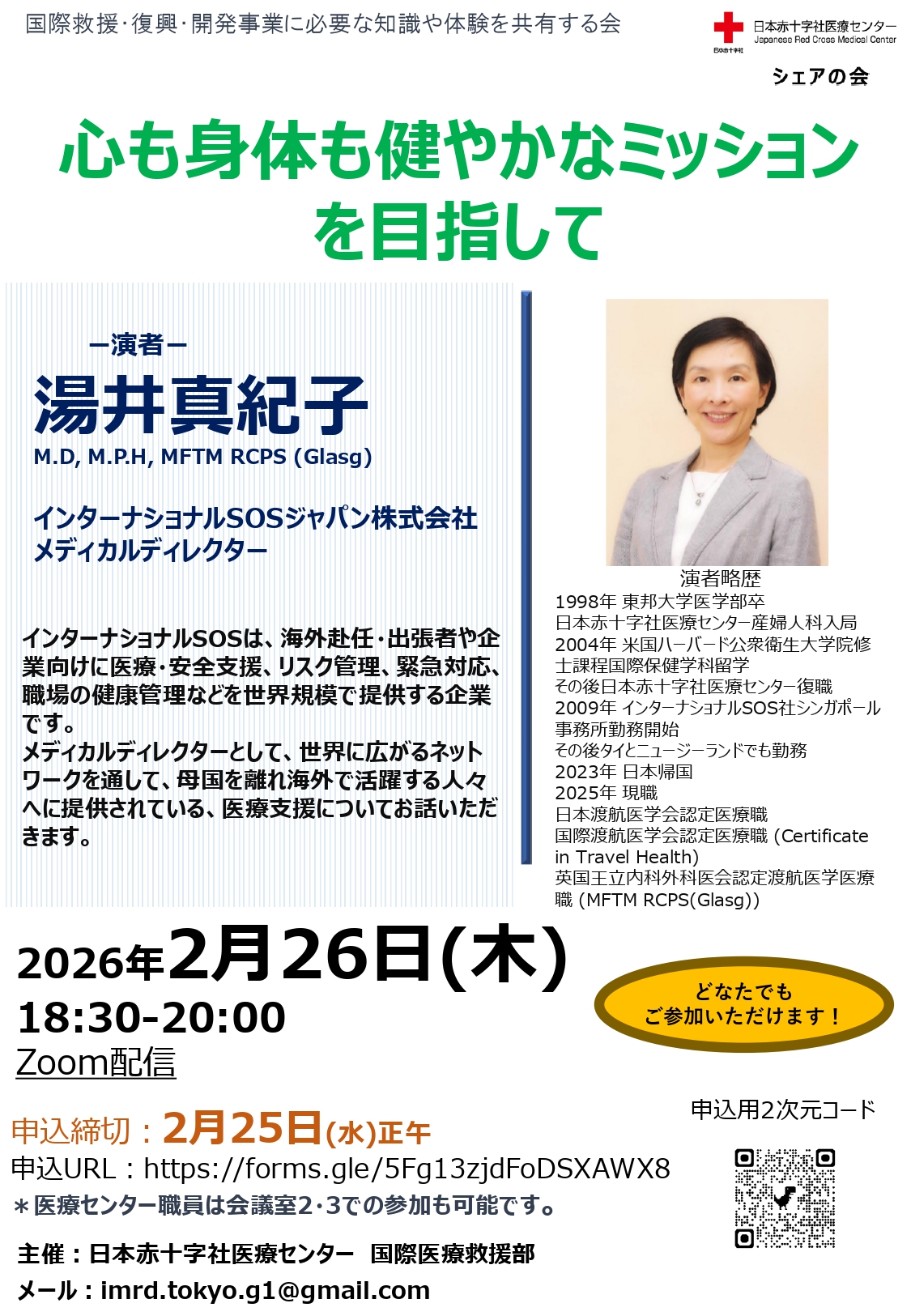 2月26日(木)のシェアの会では、「心も身体も健やかなミッションを目指して」と題し、インターナショナルSOSジャパン株式会社 メディカルディレクターの湯井真紀子氏にご講演いただきます。