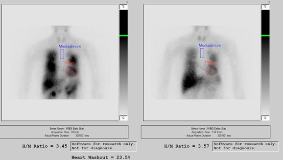 正常 早期相・遅延相での心/縦隔(H/M)比は保たれている。洗い出し亢進もなし。