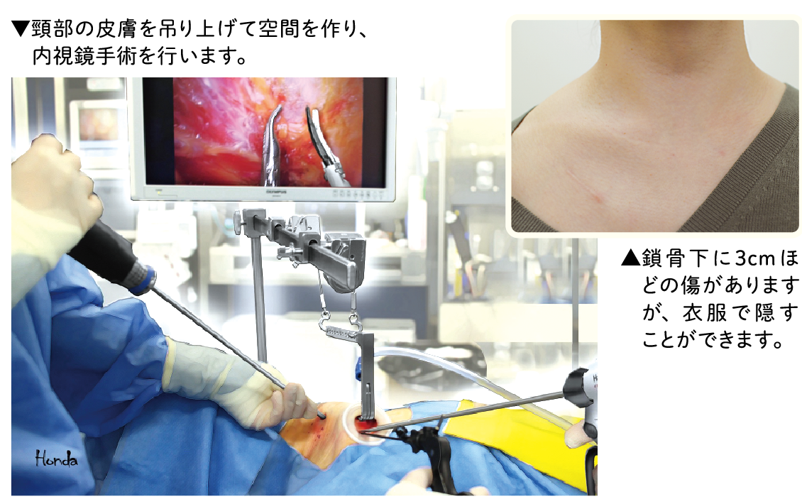 当センターで実施している内視鏡補助下頸部手術(VANS(バンズ)法手術)は、1998年に日本で考案された方法です。片側の鎖骨下の約3センチ、鎖骨上の約5ミリの皮膚を切開し、そこから内視鏡を挿入し、甲状腺の一部を摘出します。頸部に傷が残らないことが最大のメリットで、首元が開いた服でも傷跡を隠すことができます。