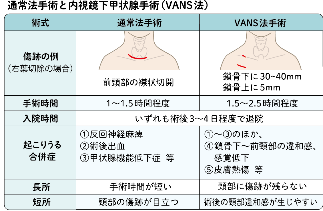 ただし、VANS法手術独自の合併症として、術後に鎖骨下から頸部にかけて突っ張る、飲み込みにくい、硬いなどの違和感やしびれが生じやすい傾向にあります。これらのほとんどは数カ月程度で解消します。入院期間や治療確実性は通常の手術とほとんど変わりませんが、手術時間はVANS法手術のほうが1時間ほど長くなります。費用もわずかですが高くなります。傷跡をそこまで気にしない、または高齢者のように身体への負担が大きい患者さんにはVANS法手術が不向きな場合があります。詳しい適応条件や長所、短所について私たちとしっかり話し合って治療法を決めていくことになります。